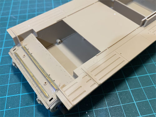Most of this detail is on the front and involves lights, and bars that protect the lights. However, these bars don’t fit over the photo-etch parts! I had to remove part of the photo-etch, fit the bars, and re-fit the photo-etch again. It’s clear that these photo-etch parts were a later addition to the kit as the plastic parts haven’t been designed to accommodate them.