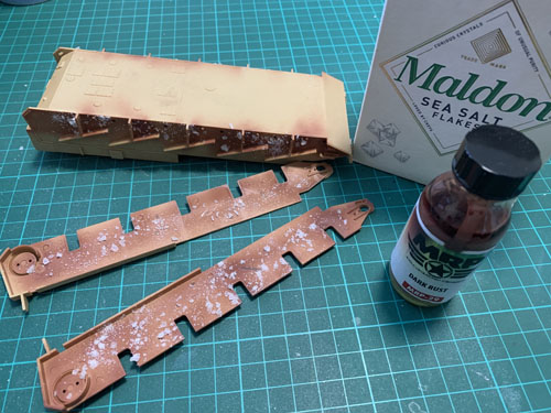 I sprayed the internal parts first with a rust colour (I used MRP lacquer paint). I then tried a few different ways of applying small blobs of rubber mask to replicate scratches. I felt I couldn’t get the blobs small enough so decided to raid the kitchen cupboards and get some salt.