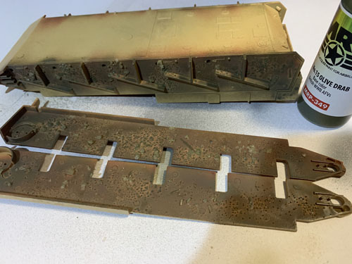 Continuing with building the main chassis I realise that I need to paint and detail some vents before putting on the side covers. Firstly the inside parts are painted in the Olive Drab colour, and the vents are then dry brushed using Mr Metal Silver colour to pick out the raised detail of the vent grill. A brown wash is then applied to darken the recesses, then after a quick wipe they are given another quick dry brush.