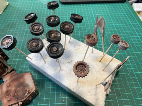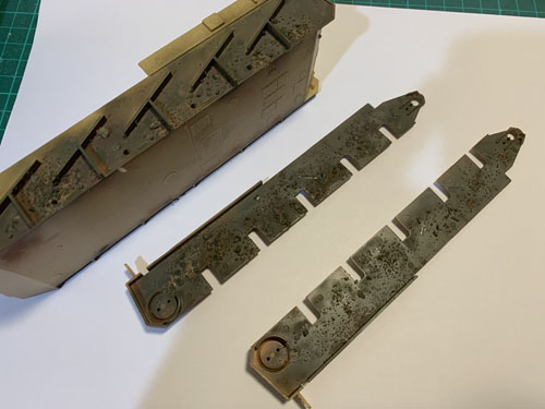 Before fitting the torsion rods that provide the suspension for the wheels I realised I was going to need to paint them, but also the inside of the compartment in which they are housed. It dawned on me this would be a good time to experiment with some weathering, chipping and rusting effects as they areas would not really be visible on the finished model.