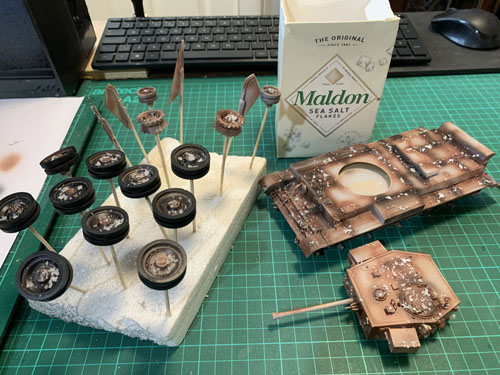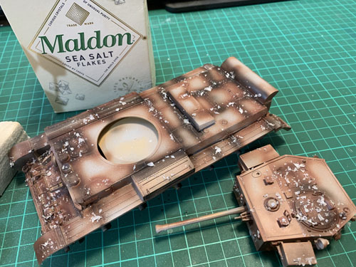 Once dry the model was sprayed with water, and salt was sprinkled where the chipping would be. I used sea salt flakes as opposed to the finer regular table salt. Some of the flakes were quite large and found that it could be crumbled which gave flakes of different sizes.
