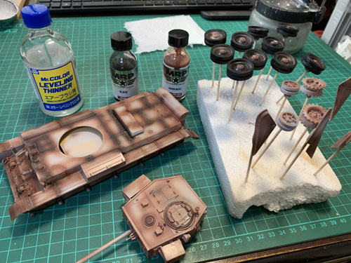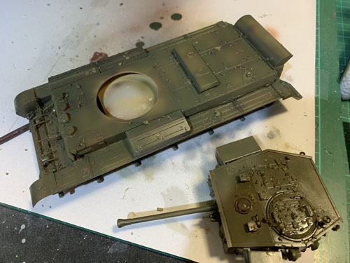 The plan is to prime using Mr Surfacer, and paint using MRP Paint. However, before going straight on with the SCC 15 Olive Drab I’ll put on some rust colour, which will show when the top colour is chipped off.
