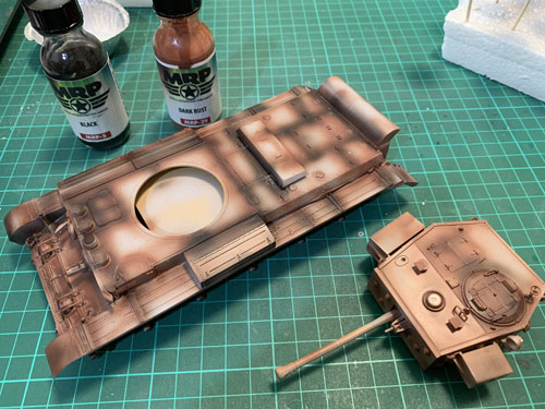 This may be a common technique for amour modellers, it may not; but I had the idea of pre-shading (as I would do with aircraft models) but instead of using black to use dark rust.