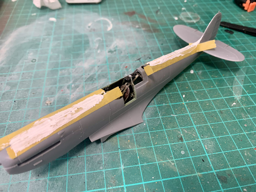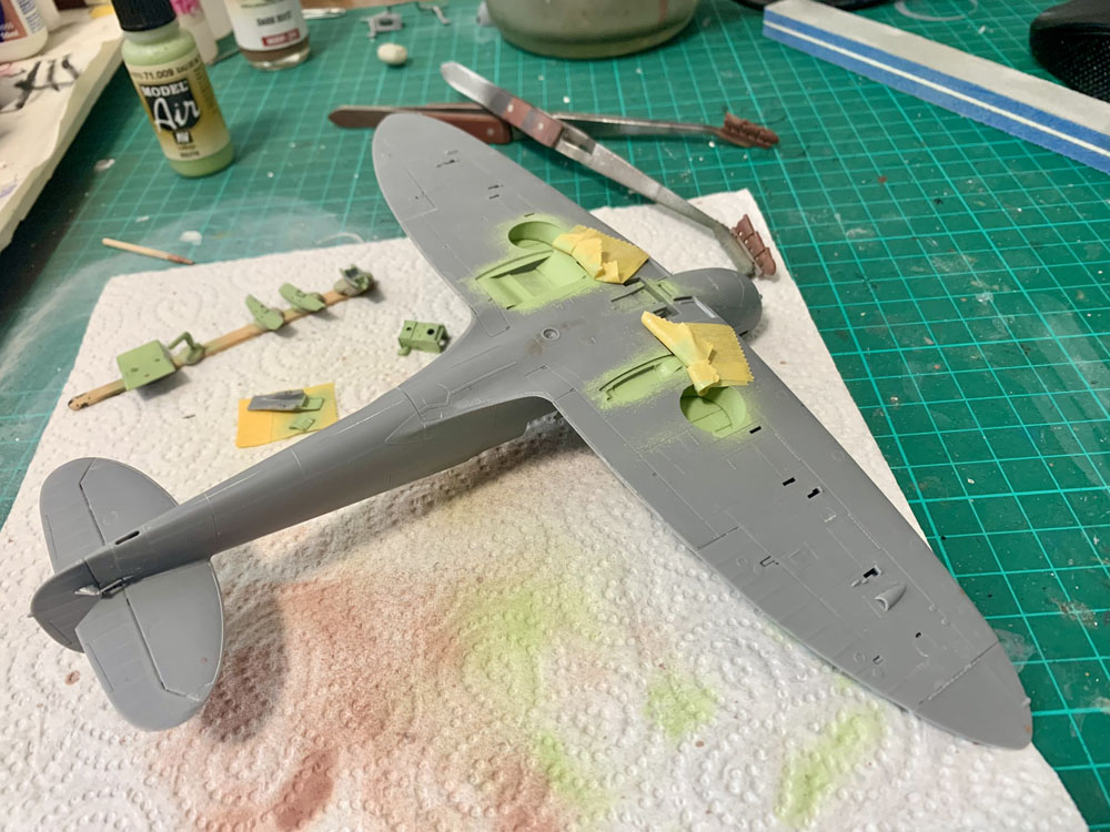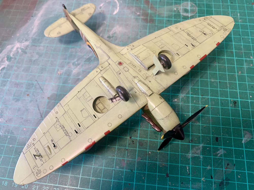 The main paint scheme was painted using Vallejo ModelAir paints, from the WW2 RAF box set – which makes sourcing the paints easier. I masked using the “Blu-Tak Worm” method, and lots of Tamiya tape. I did make a mistake but fortunately that was easy to correct.